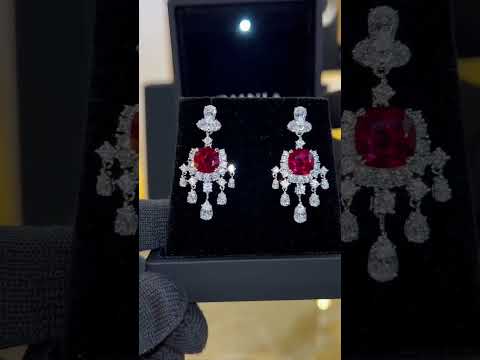 Known for their rich, fiery red hue and exceptional clarity, the cushion-cut ruby stones create a captivating play of light—making these earrings an irresistible statement piece for any occasion.