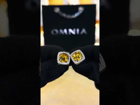 Omnia Rimas Golden Cushion-Cut Stud Earrings in High Quality Zircon Stone Rhodium Plated